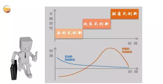 如上图所示,创新刚开始的时候需要高投入,利润为负,后来利润逐渐上升。而套利式创新从一开始就能产生利润,只是后来不断下降。怎样把这两个曲线进行叠加,产生一个更稳定的利润?