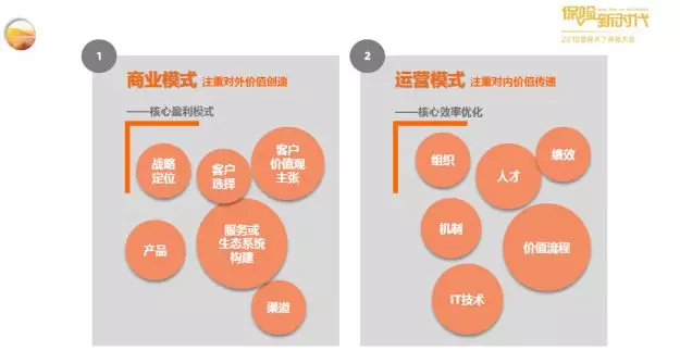 商业模式要考虑整个公司战略定位问题、客户选择问题、客户价值主张问题,包括通过什么样的产品、什么样的服务,什么样的生态平台来创造价值。所以,商业模式主要是对外的,它核心回答的是保险公司的盈利模式问题。
