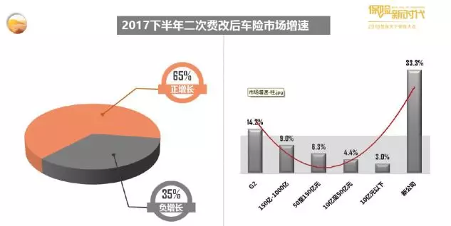 图中阴影线是2017年下半年的车险业务平均增速,大概是10%。可以看出,除两大巨头增速超过市场平均水平以外,后面的相对规模较小的公司,增速都落后于市场平均增速。