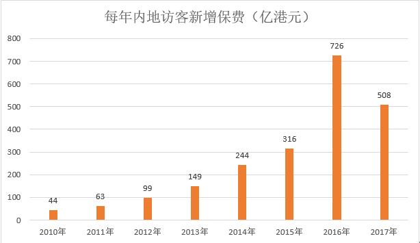 随着国民收入水平的提高,对保险需求不断增长,而与内地保单相比,香港保单有着价格低保障范围广、收益高、重疾险理赔简单等的优势。另一方面,由于人民币汇率波动较大,出于对人民币贬值的预期,部分人打算通过购买港险的方式把资金转到香港。这都加速了香港保险业的野蛮生长,并使其内地访客新增保费在2016年实现了翻倍式的跨越,香港保险代理也一度成为众人羡慕的“捡钱”职业。