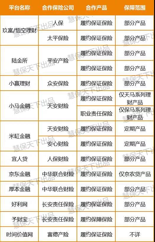 而即便是这些平台,也并不是所有的投资项目都进行了投保,只是选择部分项目与保险公司进行合作而已。如下表所示,『慧保天下』统计了部分网贷平台与保险公司的合作情况,而其中所有平台的履约保证保险都只能保障部分项目。