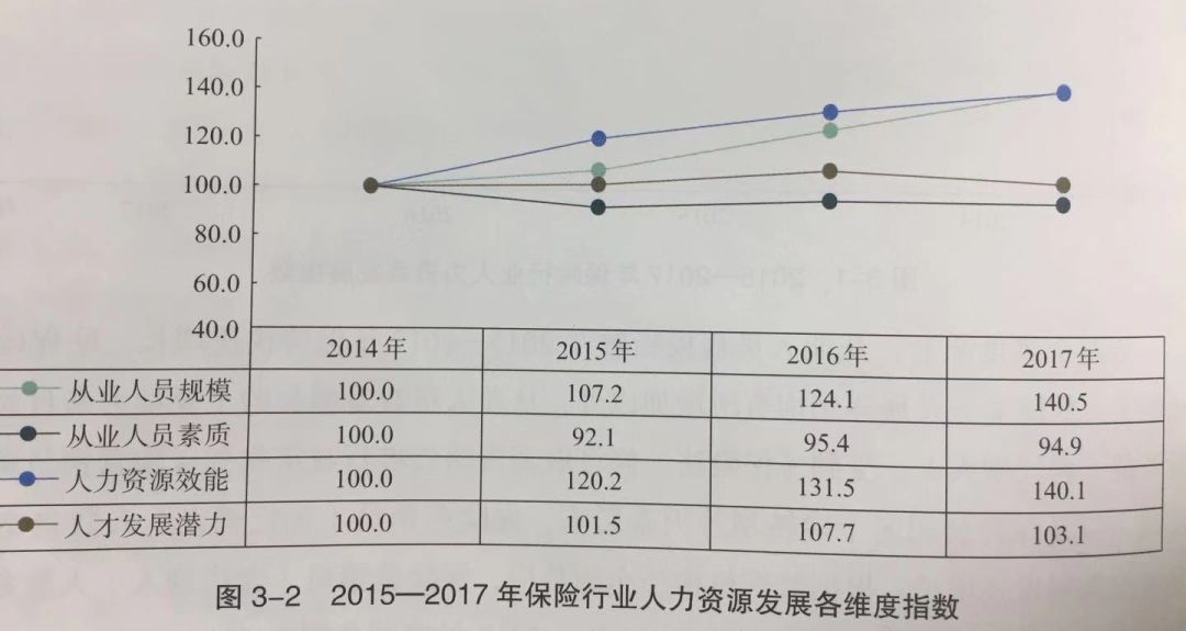 结果显示,2017年保险行业人力资源发展指数相较2016年有进一步提升,反映出保险行业从业人员(包括职工和代理人数量)数量有大幅增长,人力资源效能也有所提升。不过随着市场扩容,从业人员的素质有所下降,离职率也有所上升。