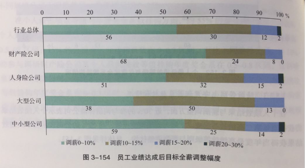 至于员工绩效结果与调薪幅度之间的关联情况,《报告》显示,对于达成业绩目标的员工调薪幅度,中大型公司高于中小型公司,人身险公司高于财产险公司。根据数据,超过一半的大型公司会给达成业绩目标的员工调薪10%以上,而近六成的中小型险企的调薪幅度低于10%。