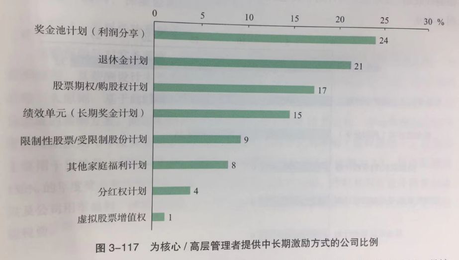 针对不同级别的员工,中长期激励计划有所不同。在为核心/高层管理者提供的中长期激励方式中,最常见的是奖金池计划,即利润分享,有24%的公司提供该项计划;而针对全体员工的中长期激励计划中,提供退休金计划的占比最高,达40%。