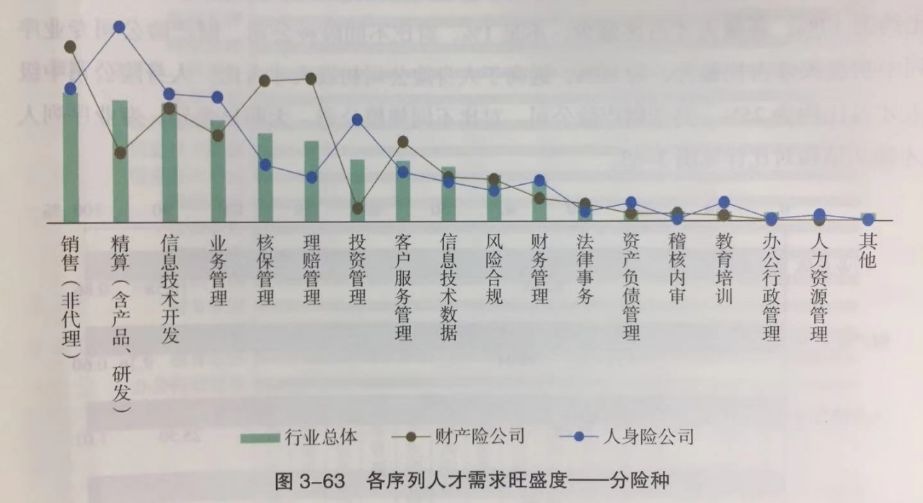 整体来看,销售(非代理)、精算(含产品、研发)、信息技术开发三个序列的人才需求最为旺盛。不过,对于人身险公司来说,精算(含产品、开发)的人才需求量最大;而对于财产险公司来说,销售(非代理)、核保核赔的需求最大。
