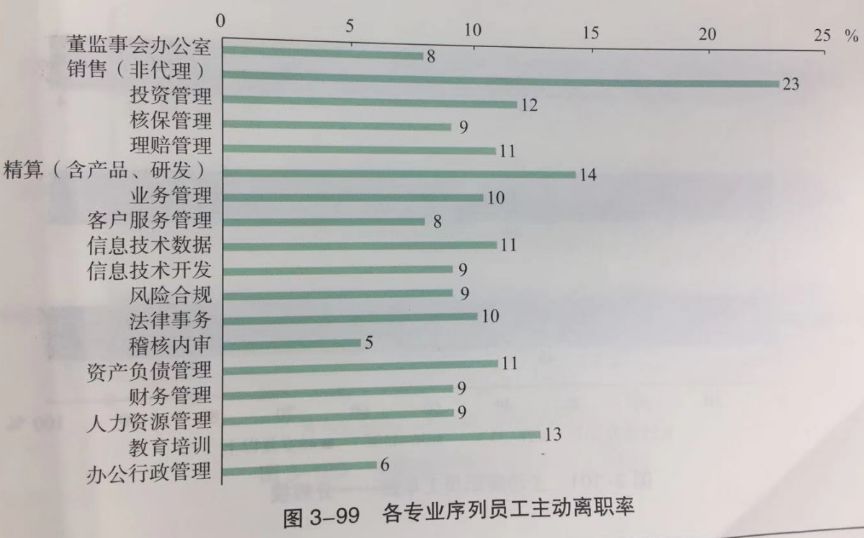 具体来看,2017年保险行业主动离职率最高的为销售(非代理)序列的员工,主动离职率达23%,精算(含产品、研发)以14%的离职率排名第二,而稽核内审、办公行政管理等序列人员相对稳定。
