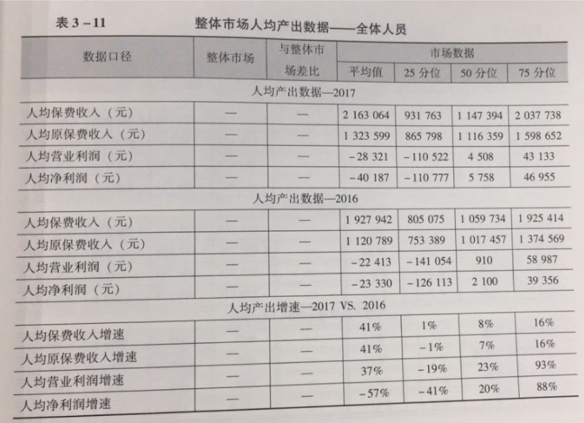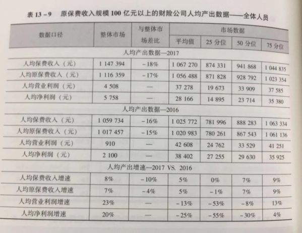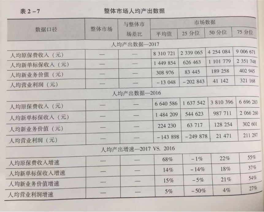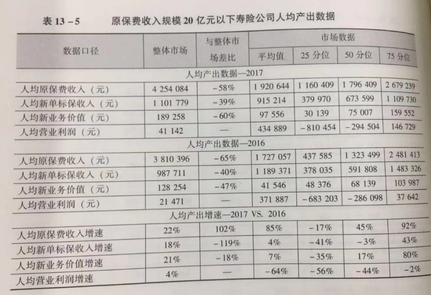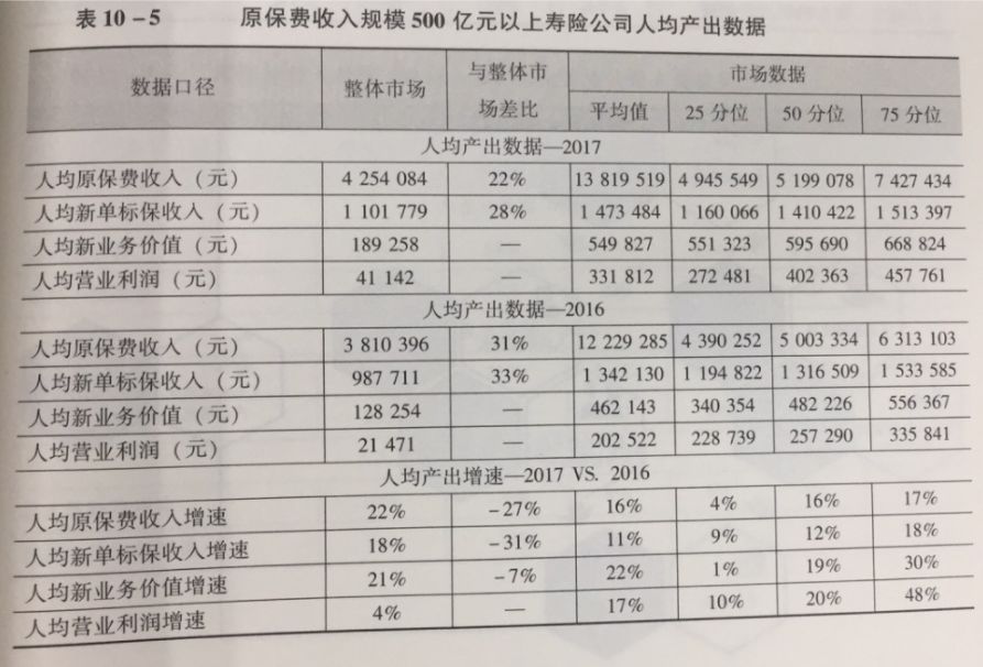 对于寿险行业整体而言,2017年其人力成本投入同比增加约20%,同时,产出增长更快:人均原保费收入的平均值达831万元,同比增长68%;人均新单标保收入达145万元,同比增长14%;人均新业务价值为31万元,同比增长15%;人均营业利润为-1.3万元,同比减亏约13万元。