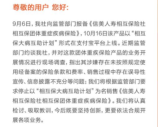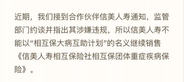 蚂蚁金服称这是由于信美人寿被监管约谈且指其涉嫌违规,所以信美人寿不能以“相互保大病互助计划”的名义继续销售《信美人寿相互保险社相互保团体重症疾病保险》。