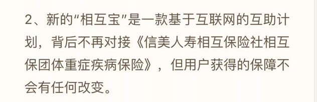 蚂蚁金服称,其将对原“相互保”服务进行升级,从“相互保”升级为“相互宝”,并指出,新的“相互宝”是一款基于互联网的互助计划,背后不再对接《信美人寿相互保险社相互保团体重症疾病保险》,但“用户获得的保障不会有任何改变”。