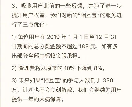 然而在很多业内人士看来,将网络互助彻底排除在保险之外,或许并不能从根本上解决问题,不受监管的网络互助平台,有可能整出更多的“幺蛾子”。这不很快就有业内人士指出,“相互保”变身“相互宝”之后,允诺2019年全年个人分摊成本一旦超过188元,将由平台进行兜底,已经实际上违反了监管曾经划定的“四条红线”——这实际上是变相承诺刚性兑付。