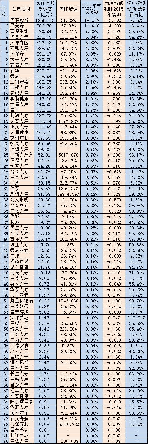近些年来主打高现价产品的人身险公司仍在其中扮演了重要的角色,例如富德生命人寿,同比增长5倍有余,华夏人寿、人保寿险成功翻一番,安邦系旗下的安邦人寿以及和谐健康也是相当生猛,成长均在400%以上。