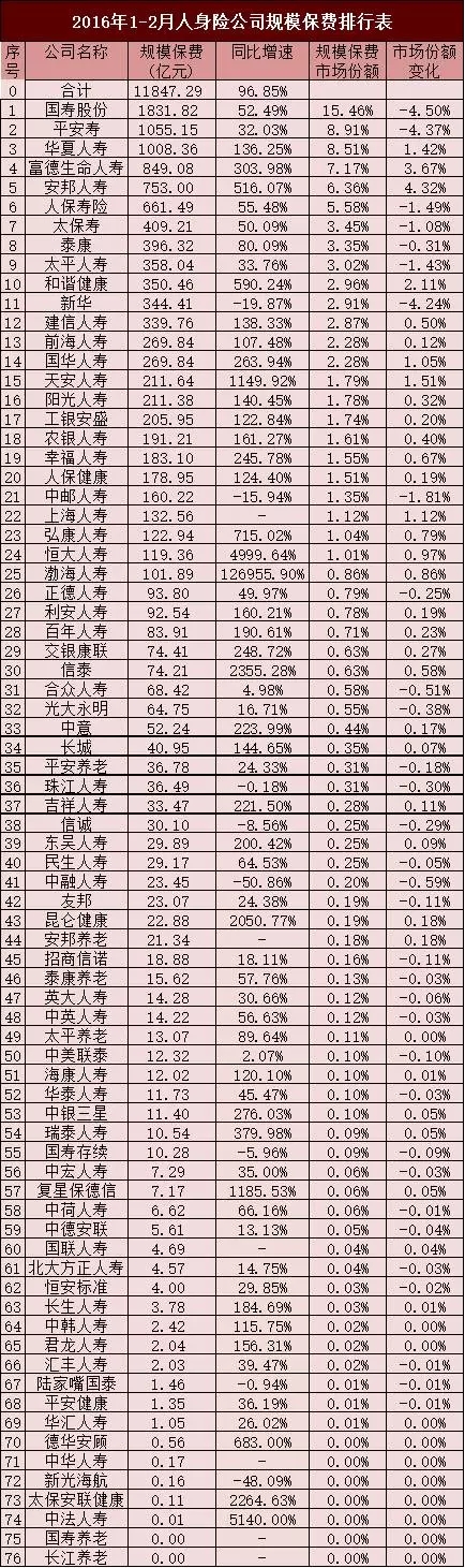 2016年前两个月,人身险公司迎来了一个漂漂亮亮的开门红,整体保费收入超过万亿大关,达到11847.29亿元,同比增速更高达96.85%,接近翻番。平台类公司继续一往无前,传统大型公司大多也表现不凡。但这样的盛况在中短存续期产品新政出台之后,恐怕再也难以为继。(详见文末表一)