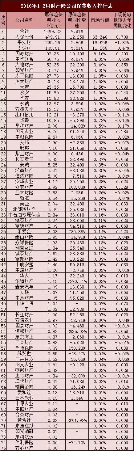 1-2月,国内财产险公司增长乏力,共实现保费收入近1500亿元,同比增速不足10%。这与国内经济持续低迷有密切关系。从个别具有典型意义的险企发展情况来看,也能说明一定问题,例如为出口企业保驾护航的中国出口信保,其保费收入在1-2同比下滑3.27%,显示国内出口贸易不振。(详见文末表二)