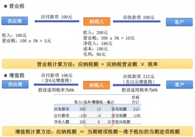 营业税与增值税都属于流转税,但具体的内涵有很大不同。营业税是对在中国境内提供应税劳务、转让无形资产或销售不动产的单位和个人,就其所取得的营业额征收的一种税。增值税则是以商品(含应税劳务)在流转过程中产生的增值额作为计税依据而征收的一种流转税。简单理解,营业税是对营业额征收的一种流转税,而增值税,则只对流转过程中增殖的部分进行征税,有增值则征税,没有增值不征税。换一种方式来理解,营业税不能进行抵扣,但增值税是可以进行抵扣的。二者的计算公式分别如下: