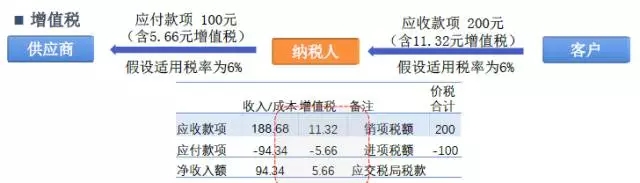 二者另外一个显著不同之处在于增值税实行价外税,由消费者承担,而营业税实行价内税,由纳税人承担。通过下图或许更有助于大家理解营业税与增值税的不同: