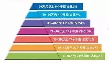 从销售价格来看,这100种车型都在43900-956000元之间,具体可分为8个价格区间,基本覆盖高、中、低多层次消费群体,其中5万-30万元价格区间的车型数量占比达到87%。