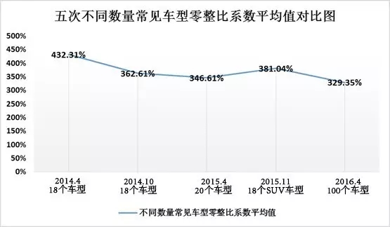 到第五次,车型样本增至100种,还在计算零整比系数以及配件负担指数的基础上,进一步计算了100种车型的平均值,以反映整个汽车配件市场的价格走向。