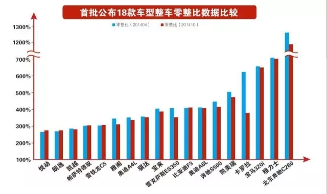 2014年的两次发布,每次都是18种常见车型及其“50项易损配件零整比”两个重要系数。虽然发布后在社会上引起很大反响,部分企业也很快下调了零部件价格,但由于很多都只是针对单价高、使用频次却很低的零部件,导致消费者在实际生活中的感受并不明显。