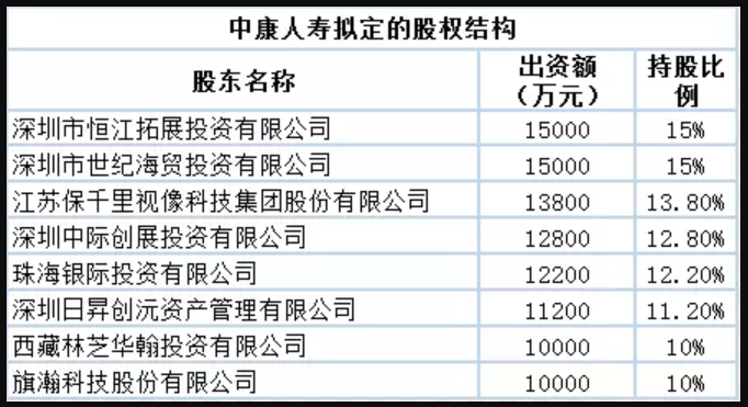 江苏保千里视像科技集团股份有限公司发布公告,拟与深圳市恒江拓展、深圳市世纪海贸、深圳中际创展、珠海银际、深圳日昇创沅、西藏林芝华翰、旗瀚科技等共同设立中康人寿保险股份有限公司,注册资本为10亿元。保千里出资1.38亿元,占中康人寿注册资本的13.80%,为第三大股东。(上交所公告)