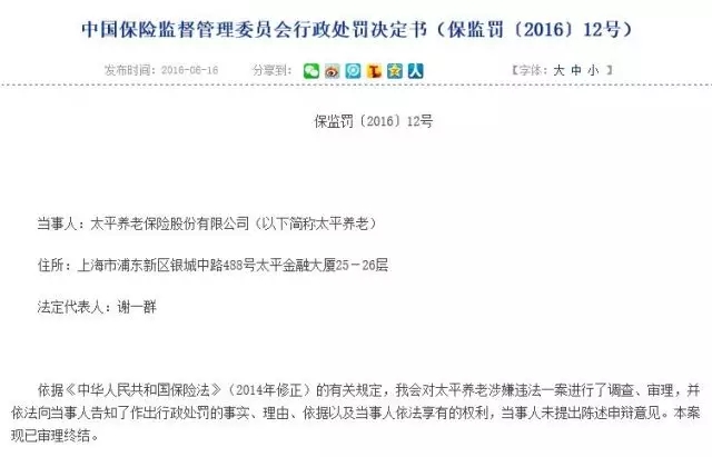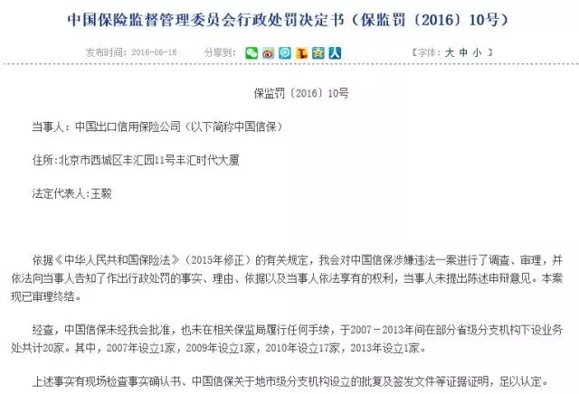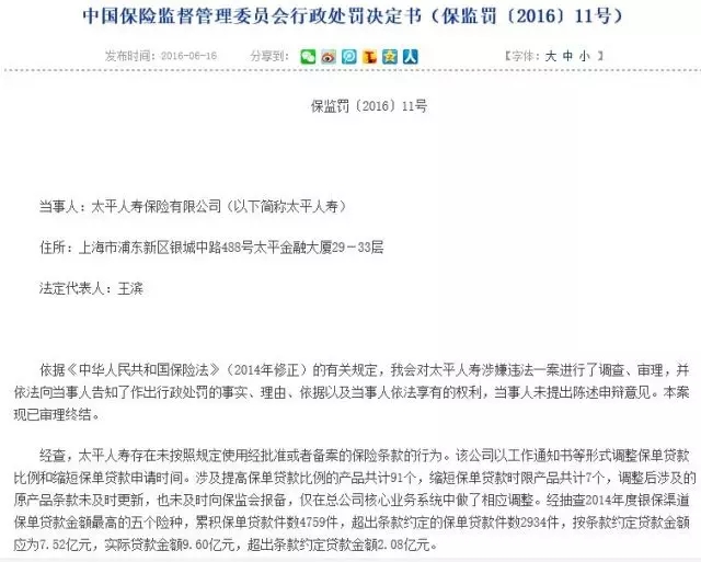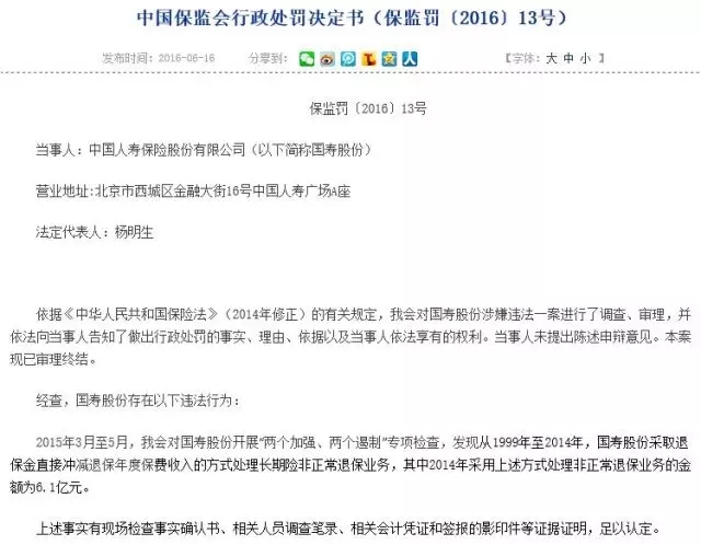 6月16日,保监会连发四个处罚决定书,指出中国人寿采取退保金直接冲减退保年度保费收入的方式处理长期险非正常退保业务,涉案金额超六亿元;中国信保未经保监会批准,在部分省级分支机构下设业务处共计20家;太平人寿以工作通知书等形式调整保单贷款比例和缩短保单贷款申请时间,超出条款约定