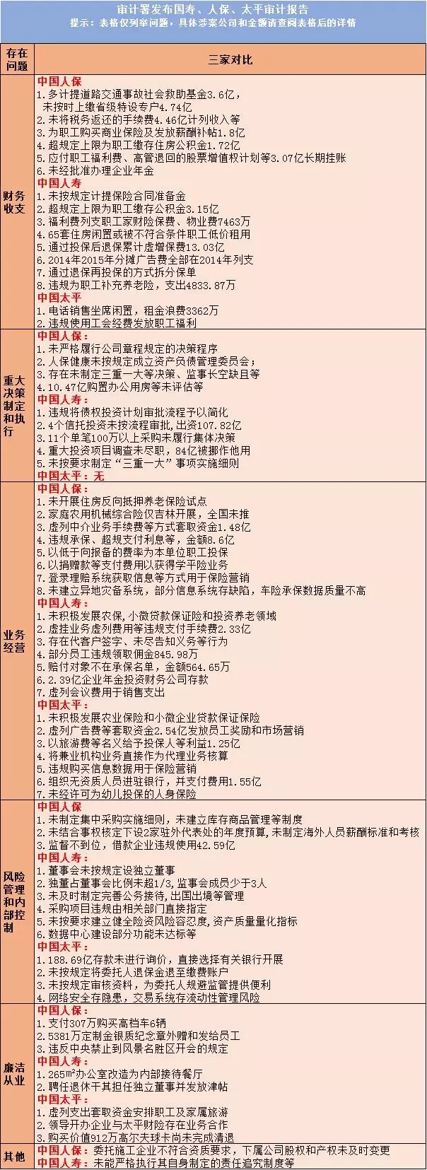6月29日,审计署网站公布对中国人寿、中国人保、中国太平三家险企的审计报告,主要针对三家险企2014年度资产、负债、损益情况的例行审计公布相关结果。审计报告表明,三家公司在财务收支、业务经营、风险管控和廉洁从业方面均不同程度存在问题,且均存在变相为职工增发福利、未按规定推进政策性保险业务的开展和虚列费用等问题,部分事件涉案金额巨大。据悉,三家公司已经开始就相关问题进行整改,具体整改结果三家公司会向社会公布。慧小保就三家公司在审计中出现的主要问题进行了列表对比,具体情况请参照表格后的文字内容。1.2010年至2014年,人保财险各省级分公司多计提道路交通事故社会救助基金3.6亿元,且未在规定时限内上缴省级救助基金特设专户4.74亿元,其中2014年多计提0.92亿元、未上缴1.16亿元。2.2010年至2014年,人保财险和中盛国际存在未将税务部门返还的代扣代缴个人所得税手续费计列收入等会计核算不规范问题,涉及金额4.46亿元,其中2014年2.03亿元。3.2010年至2014年,人保集团本部及人保财险等5家所属公司在工资总额外为职工购买商业保险及发放薪酬补帖1.8亿元,其中2014年1.19亿元。4.2009年至2014年,人保集团本部及人保财险等6家所属公司超国家规定的上限为职工缴存住房公积金1.72亿元。2014年7月停止了上述做法。5.至2015年7月底,人保集团本部及人保财险、中盛国际应付职工福利费、高管退回的股票增值权计划等3.07亿元长期挂账,未及时清理。6.人保财险2006年未经批准办理企业年金,至2014年底本金及收益形成结余6.87亿元。1.2013年10月至2015年4月,人保集团部分事项未严格履行公司章程规定的决策程序。2.至2014年底,人保健康未按规定成立资产负债管理委员会;中盛国际的子公司存在未制定“三重一大”等决策制度、监事长空缺且未召开过监事会会议等问题。3.2009年1月至2015年6月,人保寿险等公司购置办公用房等事项存在未进行资产评估、未按规定报告和决策等问题,涉及金额10.47亿元,其中2014年3.36亿元。1.至2015年7月底,人保集团未严格按照有关政策要求,开展住房反向抵押养老保险试点;“三农”保险中的家庭农用机械综合保险业务仅在吉林省开展,未推广至全国。2.2011年1月至2015年6月,人保财险等公司通过虚列中介业务手续费等方式套取资金1.48亿元,用于业务支出等,其中2014年1.34亿元。3.2009年1月至2015年5月,人保寿险等公司存在为不符合条件的投保人承保、超监管规定支付利息和无资质承保等问题,涉及金额8.6亿元,其中2014年2.57亿元。4.2009年至2014年,人保寿险以明显低于向监管部门报备的费率,为本单位职工投保团体意外伤害保险、医疗险和寿险781.92万元,其中2014年110.77万元。5.2010年至2014年,人保寿险等公司以“捐赠款”等名义向教育部门等支付费用以获得学生平安保险业务;人保财险等公司通过登录车险理赔系统获取车主信息等方式用于保险营销。6.至2014年底,人保财险未建立异地灾备系统;人保财险等公司部分信息系统存在设计缺陷,车险承保数据质量不高。1.至2014年底,人保集团未制定集中采购实施细则;人保健康未建立库存商品管理等制度,出入库登记管理不完整。2.至2014年底,人保集团未结合事权核定下设2家驻外代表处的年度预算,也未制定海外机构工作人员的薪酬标准和考核办法。3.2011年至2014年,人保资本等公司对保险资金的实际投向监督不到位,致使借款企业未严格按合同约定用途使用资金42.59亿元,其中2014年10.46亿元。1.2012年12月至2013年,人保集团本部及所属人保投控、北京万春园有限责任公司支付307.08万元购买高档车6辆。2.2012年至2015年,人保集团本部及所属7家公司支付5381.3万元定制金质、银质纪念章96 956枚,部分用于对外赠送和发放给员工。3.2013年7月,人保资本违反中央禁止到风景名胜区开会的规定,组织业务往来单位人员到吉林省白山市开会,共计支出34.67万元。此外,人保集团还存在装修工程委托的施工企业不符合资质要求、下属公司股权和产权因历史原因未及时变更等问题。1.至2014年底,国寿集团本部对股改中承接的历史存量保单业务,未按会计准则规定的方法计提保险合同准备金。2.2012年3月至2014年底,国寿集团本部和国寿股份等5家子公司超国家规定的上限为职工缴存住房公积金共计31 519.99万元,其中2014年11 564.22万元。审计指出后,国寿集团已于2015年7月停止超上限缴存住房公积金。3.2013年至2015年6月,国寿集团本部和国寿股份、国寿资管、国寿投控3家子公司及个别下属机构在“福利费”科目中列支职工家庭财产险保费、物业费等7462.84万元,未纳入工资总额核算,其中2014年2557.53万元。4.至2014年底,国寿集团本部有65套住房长期闲置或被不符合条件的职工低价租用。5.2012年至2014年,国寿股份所属江苏、上海、广东、深圳4家省级分公司通过投保后退保的方式,累计虚增保费收入13.03亿元,其中2014年2.68亿元。6.2014年,国寿股份违反权责发生制原则,将应在2014年和2015年分摊的广告费全部在当年列支,造成2014年多计支出3588.97万元。7.2013年,国寿财险合肥、南京2家中心支公司通过退保再投保的方式拆分保单,将应计入2012年保费收入的632.47万元人为调节至2013年核算。8.2012年4月至2014年底,国寿财险、国寿养老、国寿投控和中国人寿电子商务有限公司通过购买商业保险违规为职工设立补充养老保险,累