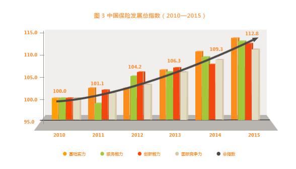 “2015 年中国保险发展指数”发布:十二五行业年均增长13.4%在今日举行的“7·8全国保险公众宣传日”主题活动上,中国保险行业协会发布“2015 年中国保险发展指数”报告。报告显示,2015年中国保险发展指数稳步增长,总指数为112.8,以2010年为100基数,比上一年增长了3.5个点。2011-2014年中国保险发展总指数提高幅度分别为1.1、3.1、2.1和3个点,增速在逐步提高。此外,报告还总结了我国保险业在“十二五”期间的五大进步,包括创新能力有提升,市场活力释放、金融结构改善以及服务大局有成效。【慧小保说】 希望行业协会能将该指数发布常态化,真实、客观地记录中国保险业发展的点滴,为保险行业发展、保险公司转型提供更多智力支持。