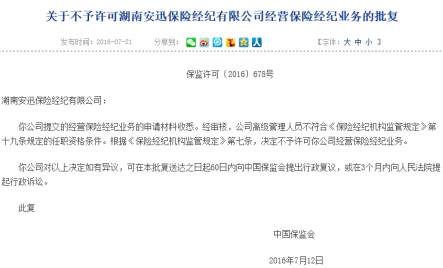 7月21日,保监会网站挂出《关于不予许可湖南安迅保险经纪有限公司经营保险经纪业务的批复》的行政许可结果,主要原因是湖南安迅保险经纪拟设高级管理人员不符合《保险经纪机构监管规定》第十九条规定的任职资格条件。据保监会网站数据显示,保监会今年累计驳回三家保险机构的设立申请,寿险、财险、中介各一家。