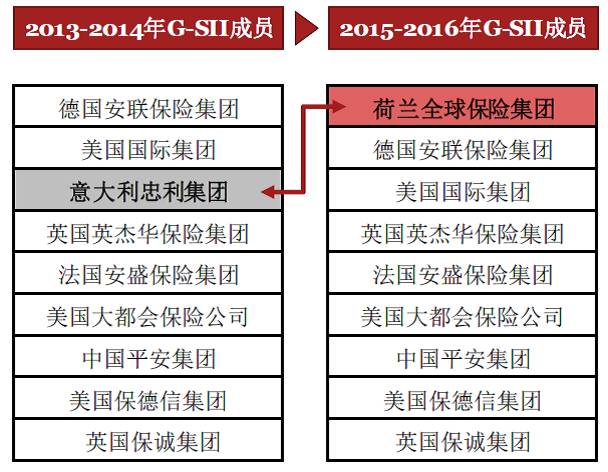 2013年7月,IAIS与FSB共同公布了首批9家全球系统重要性保险机构,此后,每年公布一次,其中,2014年与2013年完全相同,2015年与2014年只有一家公司发生了变化,意大利忠利保险退出,取而代之的是荷兰全球保险集团。2016年与2015年又完全相同。