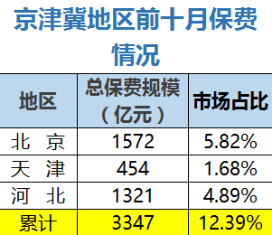 据昨日保监会公布的全国各地区保费收入情况显示,前十月全国各地区累计保费收入2.7万亿,京津冀地区保费收入3347亿元,市场份额高达12.39%。如果跨区域备案管理正式实施,京津冀的竞争或将更为激烈,会释放更多的保费收入。