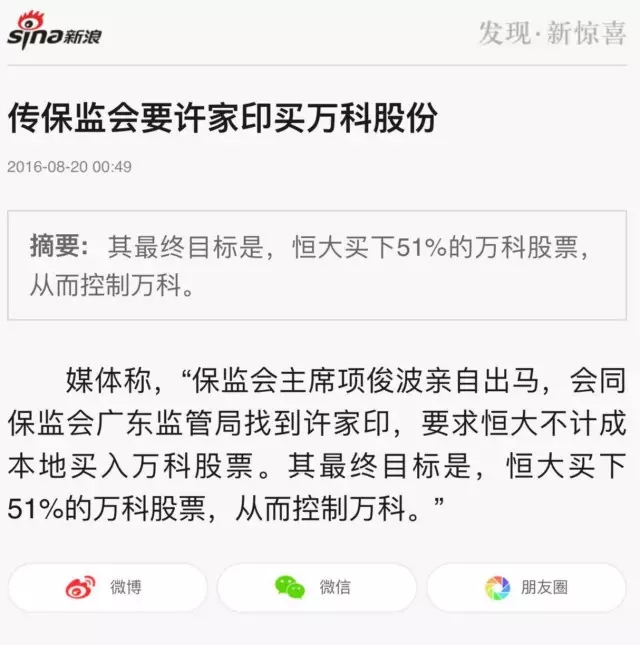 今日凌晨,“传保监会要求许家印买下万科51%股份,接盘宝能安邦”的消息为多个财经媒体所报道,为本就备受关注恒大持续买入万科一事更添“猛料”。消息称,“保监会主席项俊波亲自出马,会同保监会广东监管局找到许家印,要求恒大不计成本地买入万科股票。其最终目标是,恒大买下51%的万科股票,从而控制万科。”