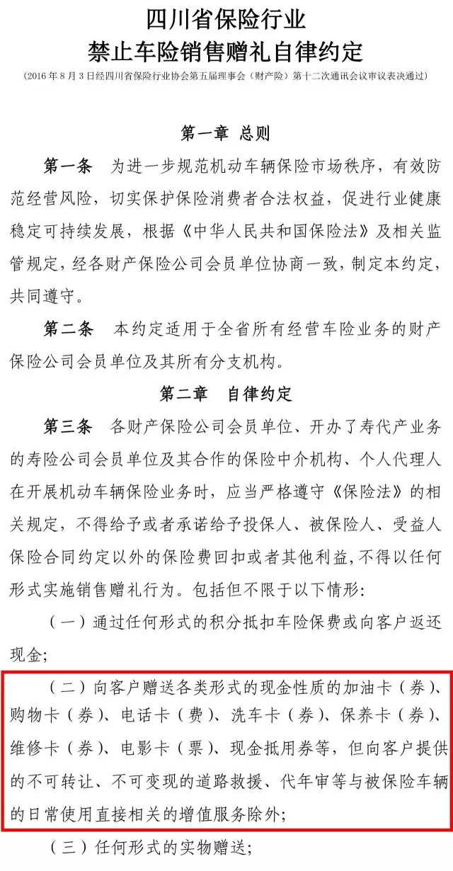 自商车费改以来,市场竞争态势有所加剧,为了防范过度竞争,各地行业协会显然已经开始出招,相继发布自律公约,针对销售环节的赠礼行为进行严控。目前,已有险企因为触线受到处罚。近日,平安产险四川分公司就收到了一张来自四川保险行业协会的罚单,金额不大,只有3万元,但对于当地其他经营车险业务的险企而言,震慑作用已经足够大了。四川出最严车险赠礼自律公约为规范市场竞争行为,8月中旬,四川保险行业协会印发了《四川省保险行业禁止车险销售赠礼自律约定》,规定财产保险公司、开办寿代产业务的寿险公司、保险中介机构、个人代理人在开展机动车辆保险业务时,不得以任何形式实施销售赠礼行为;财产保险公司不得通过公司销售人员、公司员工、保险中介机构、代理商、车商等第三方机构的工作人员以私人名义向客户赠礼、返现等;严禁通过网站、app和展架等形式进行车险销售赠礼宣传。