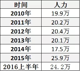 对于新华保险而言,彻底的转型还只是刚刚开头,未来还需要面对更多的问题。最迫切的一个就是,两年之内砍掉350亿元的趸交保费,可如何才能填补这个巨大的漏洞?万峰的当时的回答是续期,他表示,当前新华保险期交保费接近600亿元,2018年续期保费大概是900个亿,甚至会超过900个亿。然而,至少从目前来看,其个险的表现并不是很给力。在经历了2015年的人力暴涨之后,2016年上半年,人力出现了一定的下滑,而同期,行业的营销人力仍在持续高速增长中。活动率、有效人均产能等关键指标也出现了一定程度的下降:截至 2016 年 6 月 30 日,保险营销员渠道总人力 24.2 万人,较 2015 年年底减少 6.5%;其中有效人力11.4 万人,同比增长 37.8%;活动率达 48.2%,较上年同期下降 1.3 个百分点;有效人均产能为 1.2 万元,同比下降 8.5%。2010-2016年上半年,新华保险个险人力发展情况: