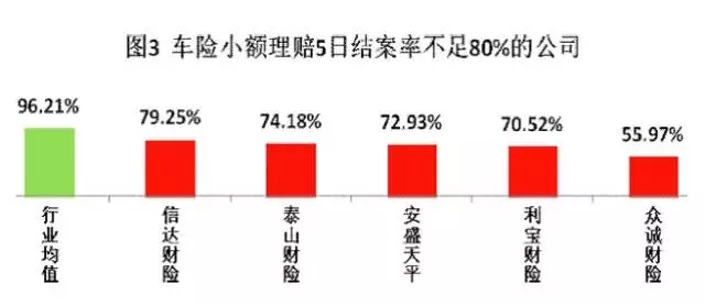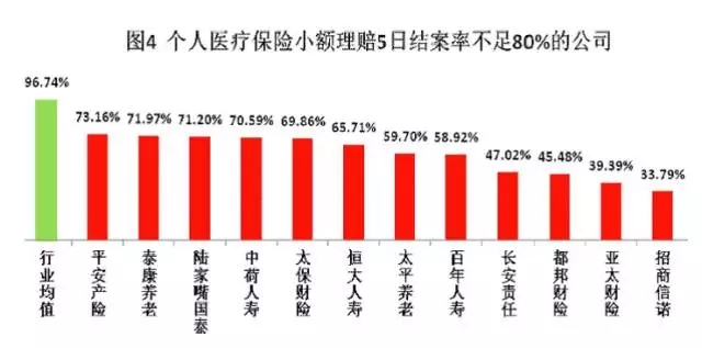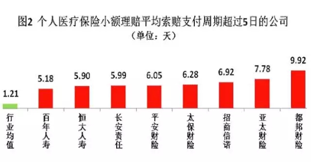 小额理赔平均索赔支付周期超过5日的保险公司共8家,分别是:都邦财险9.92天、亚太财险7.78天、招商信诺6.92天、太保财险6.28天、平安财险6.05天、长安责任5.99天、恒大人寿5.90天和百年人寿5.18天。理赔5日结案率达96.74%,12家险企5日结案率不足80%2015年,个人医疗保险小额理赔5日结案率96.74%,其中人身险公司97.33%,财产险公司89.97%。前三季度小额理赔5日结案率96.65%,第四季度97.04%,相比前三季度提高0.39个百分点。