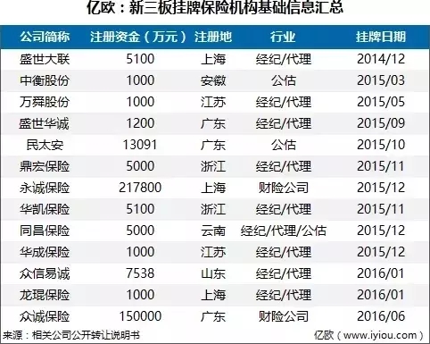 13家新三板挂牌保险机构全梳理(没错,国内只有13家)。同时借助本文为拟挂牌新三板的保险行业公司提供参考价值;文章中的财务数据主要是方便研究者透过数据看到公司背后的故事,抛砖引玉……我国保险业的总资产从2009年的4万亿,到2015年的12万亿,6年间增长了2倍。保费收入从2009年的1万亿到2015年的2万亿,翻了一番。尤其是2015年以来,随着Fintech的兴起,人工智能、大数据等这些互联网技术的运用,极大推动了我国保险事业的发展。尽管这些互联网技术的运用,使得保险产品的营销渠道延伸到线上,给传统保险中介机构带来不小挑战。但是不可否认,截止2013年底,我国保险专业机构数量达到2525家,代理机构1767家,公估机构320家。这一数字依然庞大。其实,保险业是一个特殊的精细分工的行业。在发达国家,保险公司主要从事产品开发、核保核赔等核心业务;保险经纪公司或代理公司负责产品的销售、售后服务;保险公估公司承包理赔的估损及理算。这也从目前新三板挂牌中保险中介机构数量独占鳌头可见一斑。据亿欧查询全国中小公司股份转让系统,数据显示,目前国内在新三板挂牌的从事保险业务的公司有13家。其中保险公司2家,其余11家为保险中介公司。亿欧对每家公司的基本情况作了系统梳理,并进行了归纳分类,希望能对从业者提供参考指导意义。2、基础层11家:万舜股份、盛世华诚、民太安、鼎宏保险、永诚保险、华凯保险、同昌保险、华成保险、众信易诚、龙琨保险、众诚保险。2、协议转让10家:万舜股份、盛世华诚、鼎宏保险、永诚保险、华凯保险、同昌保险、华成保险、众信易诚、龙琨保险、众诚保险。1、经纪/代理业务9家:盛世大联、万舜股份、盛世华诚、鼎宏保险、华凯保险、同昌保险、华成保险、众信易诚、龙琨保险;1、有交易4家:盛世大联、中衡股份、民太安、众诚保险;基础信息:盛世大联成立于2007年12月,初始注册资金50万元,注册地上海,公司于2014年4月股份制改造完成。成立起初只能在上海进行保险产品的代理销售,2015年取得全国经营资质。主营业务简介:专注于汽车后市场服务,从事保险产品代理销售,公司的主要产品是车险代理服务,收入占主要业务收入98%以上。公司依托呼叫中心、互联网和移动互联网平台代销车险产品。开通了“车管家服务”,依托自建供应商平台,为机动车车主提供涵盖汽车全程代办、现场救援、汽车清洗、美容、检测、酒后代驾、机场专车接送等一系列服务项目,客户主要面向银行、保险等金融企业。互联网+创新概况:公司主要产品以电销为主,互联网PC端销售平台可以帮助用户完成初步询价,不过网站页面设计缺乏人性化,用户体验差;移动端,公司开发出“盛大车险”APP,改变了车管家服务业务的销售模式,向着O2O销售模式转型,初步形成完整汽车后市场闭环服务体系。基础信息:中衡股份成立于2008年4月,初始注册资金200万元,注册地安徽,公司于2014年10月股份制改造完成。在全国从事保险标的出险后的查勘、检验和估损理算等保险中介服务。是国内首家在新三板挂牌的保险公估公司。主营业务简介:公司从事保险标的出险后的查勘、检验和估损理算等保险中介服务。特色:公司下设4个子公司(中平评估、东衡代理、中衡咨询、中联鉴定),可以为客户提供保险公估、价格评估、司法鉴定、保险代理、咨询等多个服务类型,可以为保险公司、司法部门、个人提供全方位的保险理赔等服务。互联网+创新概况:公司设立专门的电子商务部,通过网站、微信、微博对外宣传,通过线上线下结合的模式,着力打造“互联网+保险公估”的经营模式。据公司董事长杜佐岭表示,电子商务已经成为服务客户的核心平台,同时研发“易赔”APP,解决客户理赔难的问题。基础信息:盛世大联成立于2007年12月,初始注册资金50万元,注册地上海,公司于2014年4月股份制改造完成。成立起初只能在上海进行保险产品的代理销售,2015年取得全国经营资质。主营业务简介:公司从事保险标的出险后的查勘、检验和估损理算等保险中介服务。特色:公司下设4个子公司(中平评估、东衡代理、中衡咨询、中联鉴定),可以为客户提供保险公估、价格评估、司法鉴定、保险代理、咨询等多个服务类型,可以为保险公司、司法部门、个人提供全方位的保险理赔等服务。互联网+创新概况:公司设立专门的电子商务部,通过网站、微信、微博对外宣传,通过线上线下结合的模式,着力打造“互联网+保险公估”的经营模式。据公司董事长杜佐岭表示,电子商务已经成为服务客户的核心平台,同时研发“易赔”APP,解决客户理赔难的问题。基础信息:万舜股份成立于2006年3月,初始注册资金50万元,注册地江苏,公司于2015年1月股份制改造完成。初始在江苏从事保险产品的代理销售,2016年8月获得全国经营资质。主营业务简介:专注于汽车后市场服务,从事保险产品代理销售,公司的主要产品是车险代理服务,收入占主要业务收入98%以上。公司依托呼叫中心、互联网和移动互联网平台代销车险产品。开通了“车管家服务”,依托自建供应商平台,为机动车车主提供涵盖汽车全程代办、现场救援、汽车清洗、美容、检测、酒后代驾、机场专车接送等一系列服务项目,客户主要面向银行、保险等金融企业。互联网+创新概况:公司主要产品以电销为主,互联网PC端销售平台