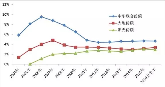 财险行业是一个寡头垄断的行业,人平太雄踞六成多江山,国寿财在背后紧追不舍,巨头争斗之外的三成天下成为中小主体论剑的江湖,中华联合、大地、阳光在2015年均夺下双百亿规模,在今年上半年也都交出了百亿的答卷,堪称第二梯队领头羊。近五年三家名次倒也平稳,中华和大地在震荡之后保持稳定,阳光则步步咬紧大地不放松。三剑客也算各有神通,但在龙头阴影之下,总是缺少存在感,中华和大地在2008年前后遭遇重创之后始终难解颓势,阳光一向雄心勃勃,但近年来风头被健康等板块占去不少,在集团一身四翼中的定位略见平庸。在龙头凭体量操纵江湖走势、新主体借力蚕食地盘的中间地带,第二梯队难免露出一丝尴尬。如果把人平太国比作江湖四绝这样的顶尖高手,那么第二梯队的领先者就颇有些五岳剑派的意思,从资历上来说要和老牌门派差上一截,也没有七十二绝技般雄厚积淀的武功,但却各自在一方领域里开宗立派力求建树,或稳步追随静待变局,或兵出奇处突施冷招,甚至很想搞个五岳联盟来对抗龙头,但却总是刷不出太多的存在感。在改革大潮汹涌、江湖质变待发的时代,第二梯队是否能打通经脉实现逆袭?图1 2004-2016上半年,中华联合、大地、阳光市场份额对比中华联合堪称命运多舛,作为发源于新疆建设兵团的一方霸主,其在成立后十年间保持了高速增长,经营范围从农场业务扩展到全险种后更是踌躇满志,但高投入高负债的成长模式为其埋下了定时炸弹,犹如强修内功走火入魔,虽终在霸道扩张之后引火上身,2007年突现巨亏,净资产一度为负,震惊了整个江湖,甚至一度流出散派传言,最终在保险保障基金的保护下幸免于难。从份额走势即可看出,2008年之后中华联合元气大伤,虽在2011年终于企稳,但终难有大的突破,曾经的西域霸主沦落至此不禁令人唏嘘。若论血统中华联合也是官家身份,堪称小人保,而在业务结构上也与人保有颇多相似之处,同样都是依靠车险和农险作为主要业务来源,渠道结构上也是极为相似,甚至在集团布局上都有亦步亦趋之感。人保寿于2005年成立,中华联合在当时也想弄个集团公司,奈何受财险风波影响搁置,在2015年方拿下寿险牌照。人保要搞金服,中华联合也在2015年兴致勃勃组建电商公司,可见其心中,始终有着和人保老大哥站在同一奖台的梦想。但事实是残酷的,中华联合虽然表面上习得了不少流行招式,但骨子里奔放的发展方式仍然扎根甚深。从其年报营业利润数据来看,其前三大商业险种均为负值,靠农险业务的盈利撑起整个大局,这种一味依靠政策性业务的做法与市场化大势终有背离,且据传集团正紧锣密鼓筹备专业农险公司,未来若剥离农险恐账面难饰。在渠道方面,中华联合仍然严重依赖中介代理,而被寄予厚望的电商渠道,保费占比名义上是10%,但互联网保费排名甚至还在大地、阳光之后,在互联网铺天盖地的攻势之下,中华联合恐怕很难杀出个漂亮的回马枪。雄踞西部、唯一一个以中华冠名、规模曾逼近平安的一代枭雄,却在粗放的发展方式下遭遇重创几乎自绝经脉,眼见人保改革风生水起,自己却逡巡不前,想必心中别有一番苦味。2016年中华联合悍然换帅,颇有些背水一战的气概,只是吾等外人看来,祭出集团大旗的没落贵族复兴之路仍长。图3 2015年中华联合和人保财险种结构:农险占比甚至高于人保,立业之本不容有失图4 2015年中华联合和人保财险渠道结构:结构极为类似,人保已然拉开代理转型大幕,中华联合却慢了半拍大地财险也算是颇有资历的一方豪杰,背靠中再大树,成立第一年保费收入就突破15亿元,在2008年之前可谓发展良好,然而好景不长,与中华联合类似,过于激进的扩张造成了偿付能力失血,被保监会勒令暂停华东五省市业务,份额在2009年之后拉出了一条不悲不喜的直线,甚至于在2015年险被阳光超越。大地并非庸碌之辈,从欧郭暴风式改革到和掌门的“二次创业”慢火细炖,经历潮起潮落但看家本领仍在,早在2007年就开展了车险电话销售,并将电网销培养成增长最快的渠道,可谓极有先见之明。要知道电销霸主平安也是在2006年才实现电销普及,可见大地长期占据老六位置也非浪得虚名。电商技术的沉淀让大地有了二次创业的资本,其互联网保费仅在三巨头之后,远胜阳光。2015年大地全资设立电商公司,意图将其打造为类似于平安金科的创新孵化平台,转型壮志不言而喻。2015和2016上半年份额的回升,虽然颇有向中再上市献礼的味道——经历重重险阻终圆上市梦的中再太需要一场胜利了——但也在一定程度上表明大地已找回些许PK感觉。反思人保与大地的改革历史,人保改革颇有些张居正的神韵,张首辅凭无上天威切分传统体制蛋糕,虽得罪诸多利益集团,但强势铁腕与怀柔笼络并举,大政落地以现实可行为先,帝国上下最终多表认同,且培养出一批支持改革的新锐力量。而大地改革却似王安石变法,立意虽好规划虽精但最终却不了了之。如今的大地固然力图中兴,但财险江湖形势已然有变,引以为傲的电商在费改巨浪和互联网主体的合围下已不复当年之勇,价格优势骤然丧失而服务口碑尚未崛起,向传统渠道回流不断,强如平安电商在9月当月也已经出现负增长,加上车险亏损阴影仍未散去,骨感现实之下挑战仍巨。图5 大地财险2015年渠道结构:强劲的直销渠道中,电商贡献了不小的力量与先扬后抑的两位同仁不