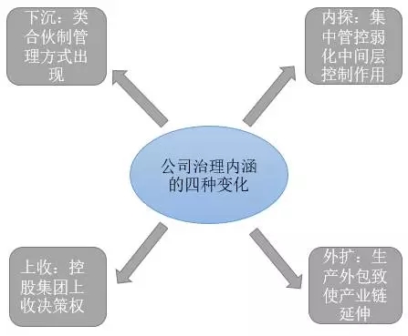 第二,公司治理的内涵在变化。保险公司的组织结构的复杂化和管理模式的创新,使得公司的边界被打破,传统中公司层级清晰、结构封闭的决策场受到冲击。简单归纳,可以总结为四种变化:
