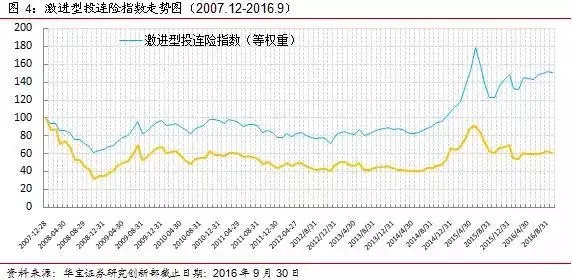 华宝证券消息,2016年9月,投连险账户单月平均收益-0.49%。华宝证券将激进型投连险月度平均收益率做等权重加权制作出激进型投连险指数,并将其与沪深300指数做对比,9月份激进型投连险指数收益-1.10%,沪深300指数收益率为-2.24%,截止至2016年9月30日,激进型投连险指数收于150.75点,调整后的可比沪深300指数收于60.93点。