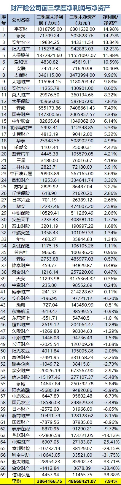 偿付能力三季报一发,各种利润排行榜纷至沓来,有读者不高兴了:不同公司之间体量相差悬殊,本不在一个量级,单纯比较净利润有何意义?确实,资本都是逐利的,不管有着怎样的战略意图,其终极目标一定是盈利,而且是用最少的资本赚取更多的钱。伴随过去保险行业的粗放式发展,我们习惯了比较险企保费规模、利润规模,但鲜少考虑股东的回报率。他们投入了大量的资金,最后得到了什么?究竟值不值?值得注意的是,近来保险行业站上风口,保险牌照也显得更加金贵,但在这样的情形下,还是有很多险企股东选择了退出保险市场,或者大比例减持。一位业内人士对此情况的评价一语中的:赚不到钱呗。可以预计的是,在经过了跑马圈地的最初阶段之后,随着市场的逐步成熟,低利率市场环境的持续,“偿二代”的深入推进,国内保险业原有的粗放的发展方式不再适用,考察一个险企是否值得投资将从比较谁的市场份额大,转向比较谁最会赚钱,最会“过日子”——降低成本,强化风险管控,提高经营效率,以更少的资本投入赚取更大利润的险企,才能笑到最后。今天,『慧保天下』就拟通过三季度的偿付能力报告,与大家一道鉴定哪些险企最会“过日子”。我们采用的数据是“净利润/净资产”这一比值,单位净资产获得的净利润越高,则说明该险企的资本利用效率越高,越会“过日子”。人身险:资产驱动负债型险企两极分化、合资险企稳健特性凸显中融人寿、新光海航人寿虽然公布了三季报,但由于截至三季度末,其净资产为负,因此数据不具可比性。在可以进行比较的70家人身险企中,盈利与亏损的险企各有35家,可谓“旗鼓相当”。整体来看,人身险公司整体的“净利润/净资产”比值为6.07%,回报率低于财产险公司平均水平。其中,18家公司的比值高于平均水平。这其中,合资险企的数量达到了6家之多,占据了三分之一的数量,显示出承袭了外方母公司较为成熟的经营理念的合资险企,虽然体量往往不大,但在经营上相当稳健。资产驱动负债型险企有5家,其中,前海人寿高居榜首,达到了26.73%,甚至高于平安寿,其余4家分别是弘康人寿、安邦人寿、华夏人寿、珠江人寿。这或许可以在一定程度上解释为什么“资产驱动负债的发展模式”在近年来大受欢迎。传统型险企则有7家,显示出了较为稳健的发展步伐,均为大中型险企。包括平安寿、国寿股份等。“净利润/净资产”比值低于行业平均水平,但大于零的险企有17家,四家成立较早的银行系险企均在此列,显示了相似的发展策略;合资险企依然占据大头,数量达到8家,但老牌的友邦,在其中居于末位;资产驱动负债型险企则只有和谐健康,濒临亏损。“净利润/净资产”比值为负数的公司有35家,成立时间较短的险企为主,但也有不少资产驱动负债型险企,例如人保健康、光大永明、国华人寿、天安人寿、安邦养老、渤海人寿、富德生命人寿等等,显示在投资收益率大幅下滑的情况下,资产驱动负债型险企已经呈现出了两极分化,投资能力强者,依然高歌猛进,投资能力差者,则如临大敌。财产险:整体优于人身险企,农业险公司盈利能力差异大纳入统计的69家财产公司的“净利润/净资产”比值平均值为7.94%,明显高于人身险公司6.07%的平均水平。且净利润为正数的公司为41家,显著高于人身险行业的35家,显示了在投资收益率大幅下滑的情况下,具有更强的金融属性的人身险行业更容易受到冲击。其中,高于平均水平的财产险公司只有11家,大中型险企居多,包括人保财险、平安财、太保财、以及位于第二梯队的阳光财产、大地财产、英大财产,两家农业险公司的表现也相当出色,分别是安华农业以及安信农业。此外还包括两家外资险企:爱和谊以及安联。这其中,平安财的表现最为出色,净资产回报率达到了14.98%,居于所有公司之首。一向并不引人关注的永安保险表现也堪用“惊艳”二字形容,单位净资产获得的净利润紧随平安财之后。“净利润/净资产”比值低于行业平均水平,但大于0的财产险企有30家,其中合资险企有11家,与合资人身险企类似,均堪称“稳健”;主要的中型险企,太平保险、国寿财险、中华联合、华泰财险、天安财险等也都在此列。“净利润/净资产”比值为负数的28家财产险企,主要是一些成立时间较短的险企,例如三家互联网保险公司均在此列:安心保险、众安在线以及泰康在线。也包括三家农业险公司:阳光农业、国元农业、以及中原农业。对比居于第一梯队的安华农业以及安信农险,充分显示虽然农业保险利润空间较大,备受险企欢迎,但手握一手好牌,并不一定就能够打赢。还有一些成立时间较长的险企也在这个梯队中,例如浙商保险、信达保险、利宝互助、国泰财产、亚太财险等。值得注意的是,这些险企近年来均有发生、或将要发生股权变动,正如本文开头所言,资本的最终的目的一定是利润,不管商业模式多么诱人,一旦长期不能获利,变现就一定会成为股东的选择。现阶段为获得保险牌照、保险公司股份不惜一切代价的股东们,最终谁能长久留在这个行业?