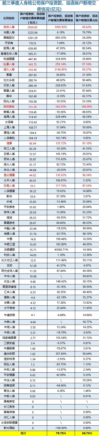11月7日晚间,保监会官网披露了前三季度保险业经营情况,寿险仍旧保持了较高增速,安邦系距离国寿的第一位置仍有数百亿的差距;产险增速继续低于两位数,人保财险继续上月的势态,保持了两位数的增速。产险业务中,交强险原保险保费收入1226.87亿元,同比增长7.70%,寿险公司未计入保险合同核算的保户投资款和独立账户本年新增交费10647.00亿元,同比增长78.88%。从保户投资款新增交费和投连险独立账户新增交费两项来看,安邦人寿仍旧保持较高的增速和保费占比,华夏人寿该项业务保费居高不下,不过增速已经在个位数,国寿股份该项业务收入超1200多亿元,不过占比较低。排名前十的险企中,前海人寿、弘康人寿、恒大人寿这两项业务占比较高。从保费数据看,中短存续期产品新规开始发力,安邦人寿、华夏人寿、富德生命人寿这两项业务占比略有下滑,前海人寿略有增加。前三季度,信诚人寿、中融人寿、君康人寿和新光海航人寿仍旧是负增长,新华保险实现0.1%的正增长,是前十中唯一一家不足千亿规模保费的险企。排名前十的险企中,仅安邦系高于行业平均增速,其他九家险企依旧保持两位数的增长速度。国寿股份前三季度增速超50%,远远高于平安、太保两家险企。从增速看,资本驱动型的保险公司增速仍旧耀眼。恒大人寿、天安人寿、渤海人寿、上海人寿等保费增速远远高于行业平均水平。财产保险公司经营情况比较稳定,人保财险继续扩大自己的领先优势,保持了两位数的增长速度。其他排名前十的保险公司中,中华财险依旧是负增长,较上月看有所收窄;大地、国寿财险增速较高;出口信用保险公司上月曾出现了近8%的负增长,但前三季度整体实现了正增长。在纳入保监会统计的全部的80家财产险企中,15家出现了保费负增长,相比上月的18家有所减少,其中安邦财险前三季度保费收入不足35亿元,同比增长-10.70%。众安保险增速依旧强劲,前三季度保费收入22.57亿元,同比增长60%。