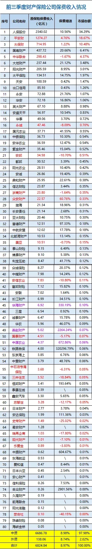 前三季度保费数据出炉:信诚、君康等五险企保费不升反降,中华财险等15家财险公司仍持续负增长行业动态