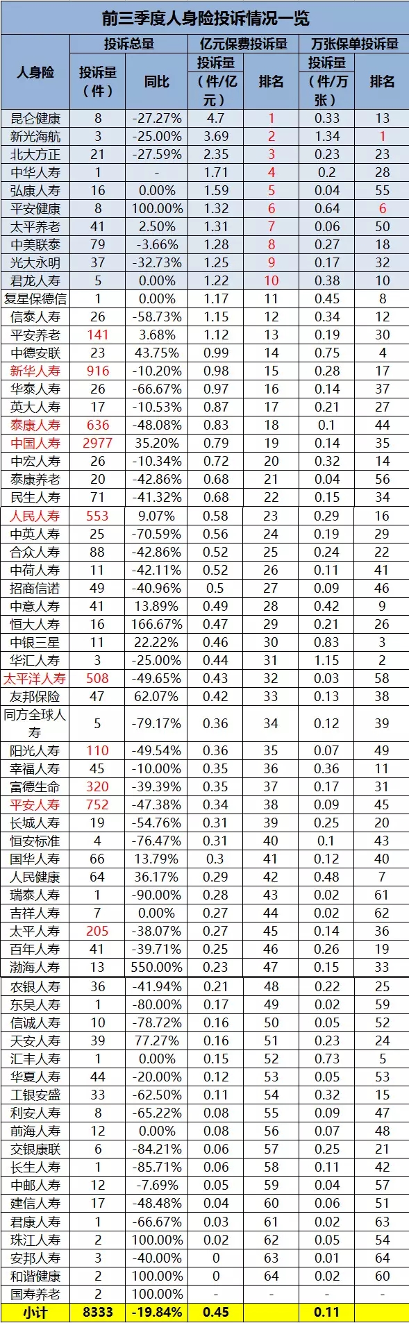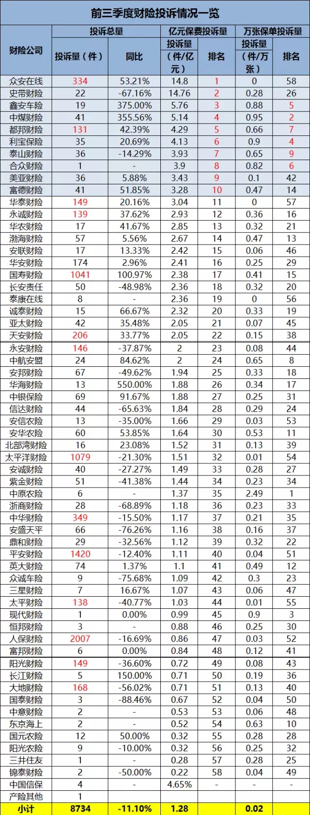 保监会通报前三季度投诉情况:亿元保费投诉量众安、昆仑等中小公司挤满前十,人保、国寿投诉量最大行业动态