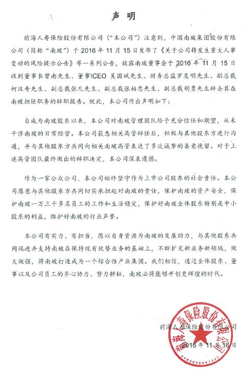 前海人寿:从未干涉南玻A的日常经营 前海人寿16日早间发表声明称,自成为南玻A股东以来,从未干涉南玻A的日常经营。而早前南玻A公告称,公司董事会15日收到董事长曾南、CEO吴国斌、财务总监罗友明、副总裁柯汉奇、副总裁张凡、副总裁张柏忠、副总裁胡勇辞去其在南玻集团担任职务的辞职报告。对