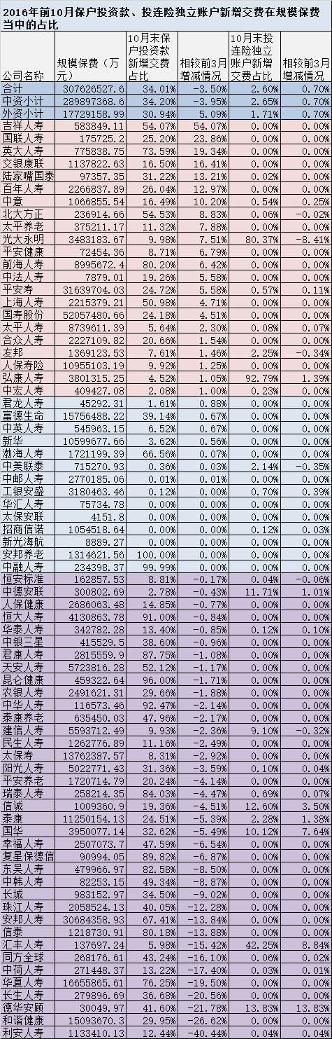 吉祥人寿,根据保监会官网发布的数据似乎是保户投资款新增交费占比上升最快的一家公司,前3月还为0,10月末,占比已经达到了54.07%。但前2月,该公司的保护投资款新增交费已将近13亿元,前3月显示为0,很有可能是数据本身出现了错误,不足采信。