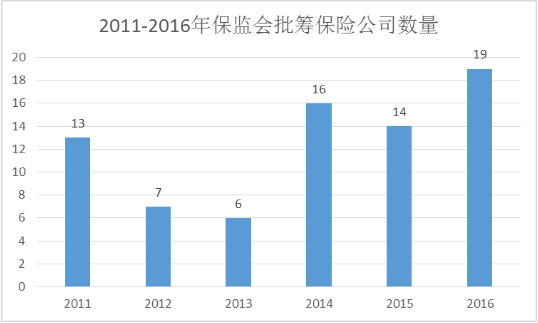 随着近些年不断有资本涌入保险业,排队等待批筹的保险企业数量越来越多,与之相伴的是保监会批筹的保险企业的数量显著增加(如图1所示)。根据保监会官网发布的数据,2016年,保监会批准筹建的各类保险企业一共是19家——自2011年末,项俊波当选保监会新一任主席以来,创下了历史新高。