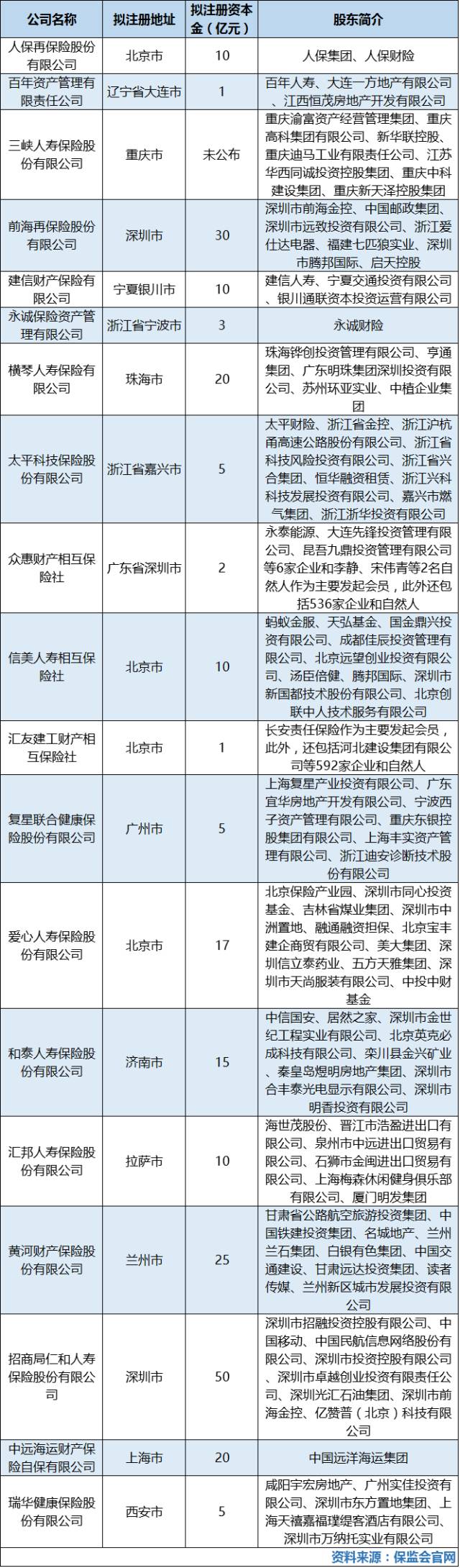 从批筹公司的类型来看,包括6家综合性寿险公司、2家综合性财产险公司、3家专业险公司(2家健康险公司,1家科技保险公司)、3家相互保险、2家再保险公司、2家保险资管公司,1家自保公司。19家获得批筹的保险公司中,综合性的保险公司只有8家,其余均为其他类型的保险主体,显示了监管鼓励市场多元化发展、专业化发展的监管思路。