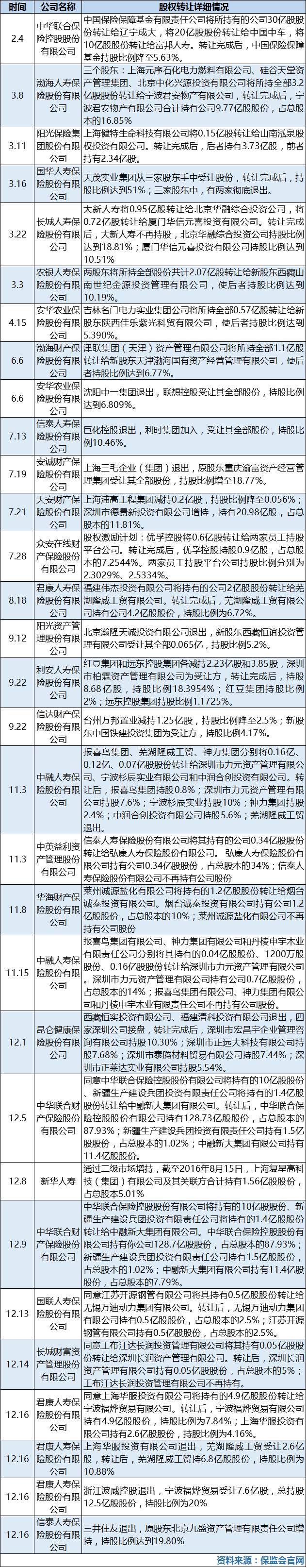 除了参与发起设立保险公司,通过股权转让的方式进入保险业,也是资本所看重的一种方式。『慧保天下』统计,2016年全年,保监会官网共计披露了41次股权转让——在资本潮涌的年代,保险公司的股权转让也变得更加频繁。