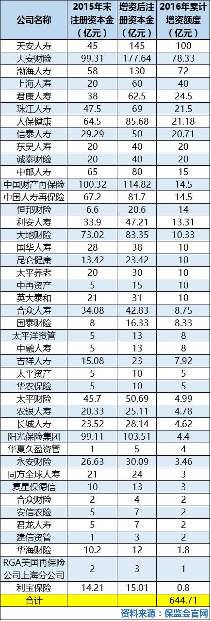 2016年一季度开始,中国保险业正式进入“偿二代”时代,险企在资产端以及负债端的行为都将直接影响到其偿付能力的表现,尤其是对于一些资产驱动负债险企而言,由于销售了大量中短存续期产品,更是给自身的偿付能力增加了巨大的压力。为了提升偿付能力,自2015年开始,险企就掀起了一股增资潮。『慧保天下』曾统计,仅2015年就有21家人身险公司实施了增资,总的增资额度达到了592.62亿元。进入2016年,险企增资潮仍在延续。按照保监会官网披露的资料,2016年共计有43家保险企业的注册资本金(运营资金)有了不同程度的增加,累计增资额度更是达到了644.71亿元。