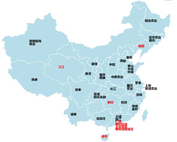 地方系财险主体分布地图,红色为待批主体