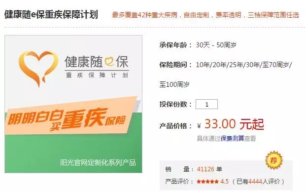 一款在2014年发布的、只在线上销售的重疾险产品,在推出两年以后,在各种新产品层出不穷的当下,销量不但没有下滑,反而不断攀升,截至目前,该产品累计销量已经超过40000单——这款产品正是阳光人寿于2014年推出的“健康随e保”重疾保障计划。