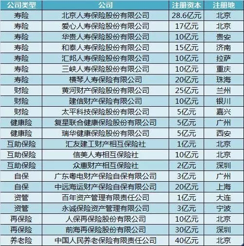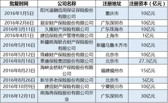 根据保监会公开资料显示,2016年,中国保险市场共有22家保险机构获批筹建,注册资本共计280.6亿元,其中寿险公司7家;财险公司和互助保险各3家;健康险、再保、保险资管公司、自保公司各2家;养老险公司1家。